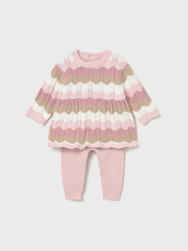 Maglione manica lunga per neonata. Girocollo. Chiusura con bottoni sulla schiena per facilitare la vestibilità del capo. Comodo tessuto di punto. Elementi decorativi: ricami, dettagli a costinePantalone per bebé. Elastico in vita. Elementi decorativi: dettagli a costine.
