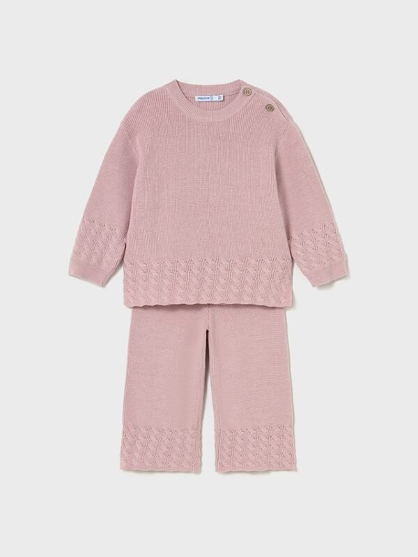 Maglione manica lunga per bebé. Girocollo. Chiusura con bottoni sulla spalla per facilitare la vestibilità. Elementi decorativi: apertura decorativa, elementi decorativi intrecciati. Pantalone per bebé. Elastico in vita. Elementi decorativi: elementi decorativi intrecciati.Tuta 2 pantaloni bambina