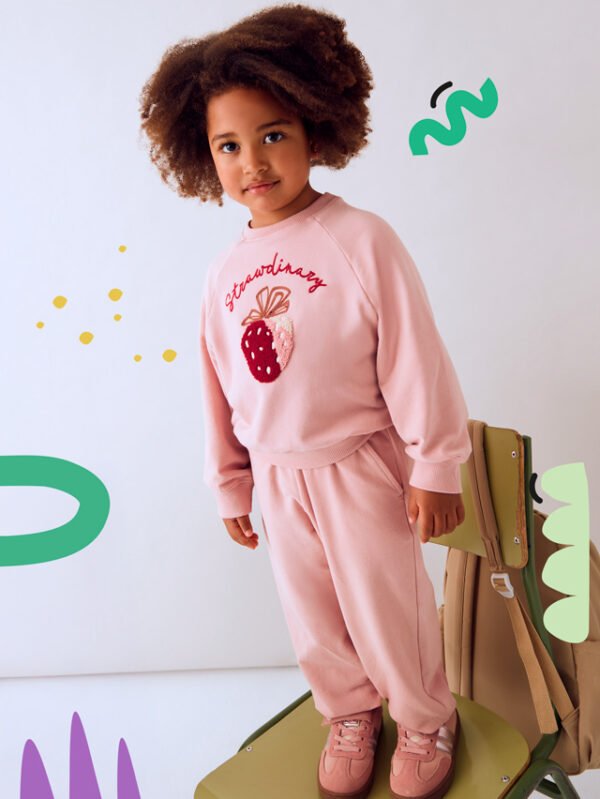 Felpa manica lunga per bambina con polsini elasticizzati. Girocollo. Morbido tessuto di cotone elasticizzato. Elementi decorativi: ricami . Pantalone per bambina della linea sporty, molto comodo. Vita elasticizzata con cordoncino regolabile.Tuta stampata