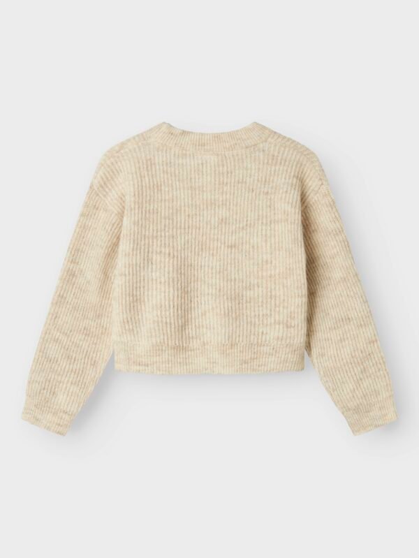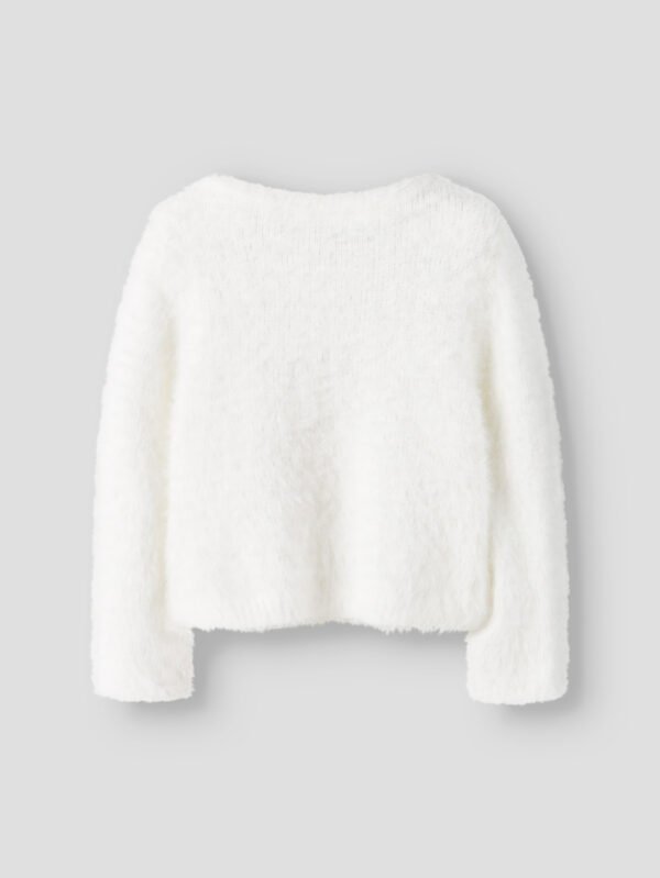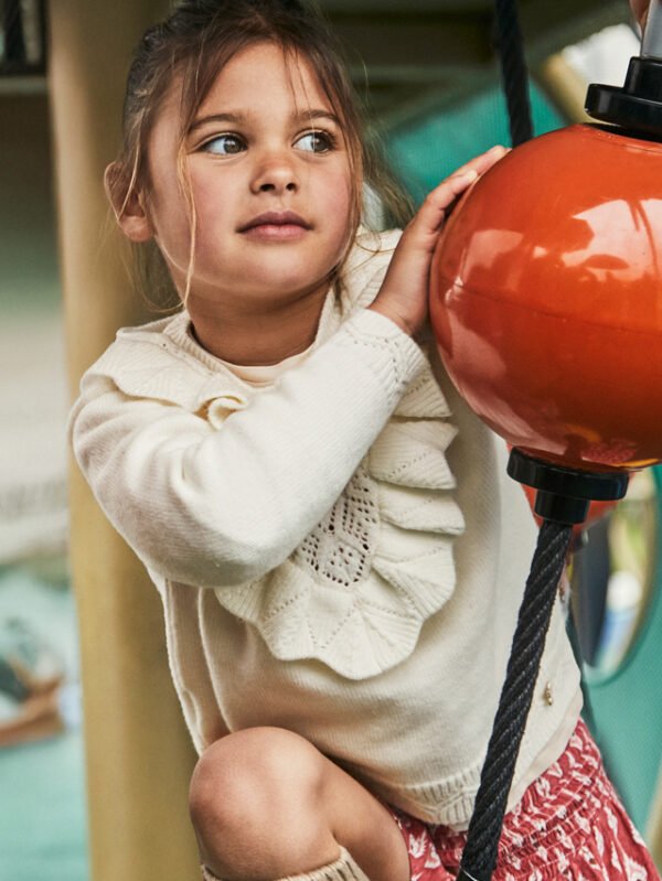 Contiene poliestere riciclato. Maglione manica lunga per bambina. Girocollo. Tessuto in tricot morbido al tatto. Elementi decorativi: dettagli traforati, volant decorativo.