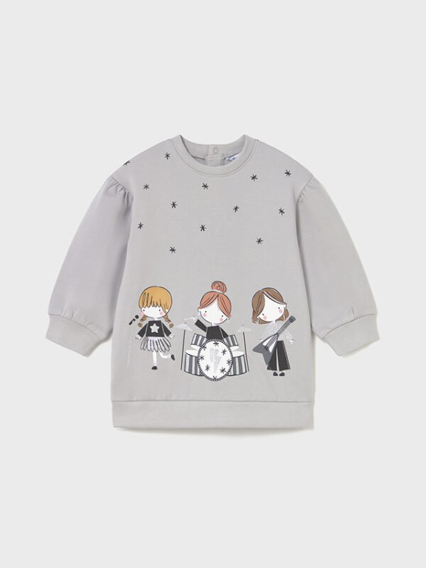 Vestito manica raglan per bambina. Modello con scollo a barca. Caldo tessuto in felpa pesante ideale per proteggere dal freddo. Modello con riccio. Deliziosa borsa per bambina pensata per conservare i suoi accessori preferiti. Un comodo accessorio che completa il suo look.Vestito felpa grafica neonata