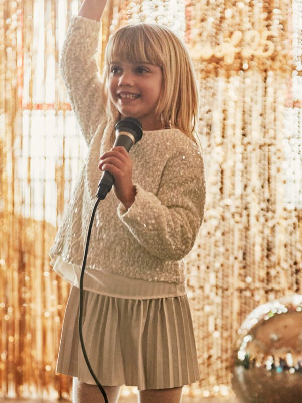 Blusa manica lunga per bambina. Girocollo. Design con finto capo in sovrapposizione. Chiusura con bottone sul colletto per facilitare la vestibilità. Elementi decorativi: paillette. Vestito senza manica per bambina. Girocollo. Modello dal design plissettato.Vestito con gilet neonata