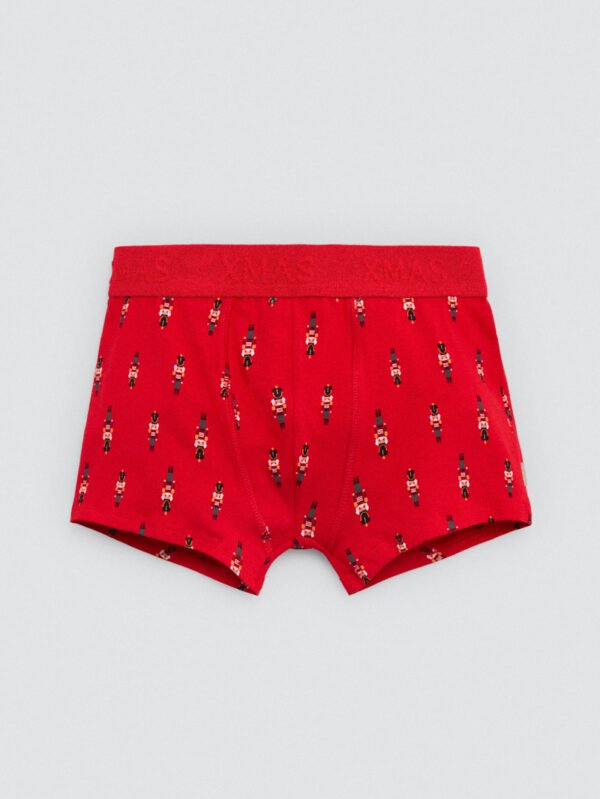 Boxer da bambino con stampa di uno schiaccianoci su sfondo rosso. Un design natalizio, perfetto per le feste.Boxer per bambini con stampa natalizia