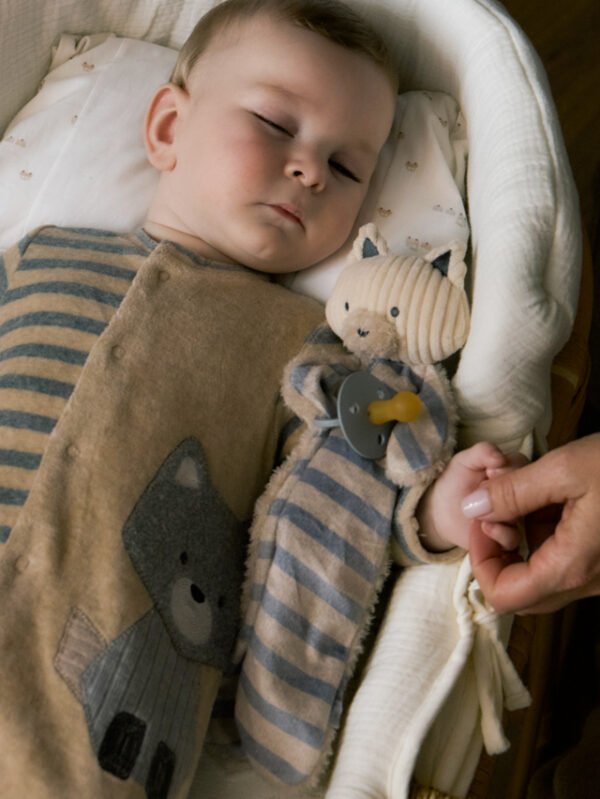 Calda copertina con la quale il tuo piccolo/a si sentirà protetto e coperto durante i suoi riposini. Elementi decorativi: ricamo. Dolce peluche neonato con copertina incorporata che diventerà il suo compagno di giochi e di riposo.Doudou porta ciuccio animaletto neonati