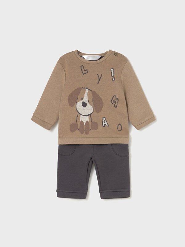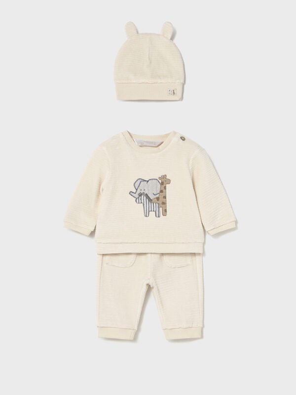 Felpa manica lunga per neonato. Girocollo. Bottone sulla spalla per facilitare la vestibilità del capo. Elementi decorativi: applicazioni decorative, ricami . Pantalone per neonato della linea sporty, molto comodo. Elastico in vita. Tasche funzionali nella parte anteriore. Cappello neonato in tessuto caldo e flessibile che garantisce una vestibilità comoda e protegge dal freddo. Elementi decorativi: applicazione orecchie.Tuta con maglietta bambino