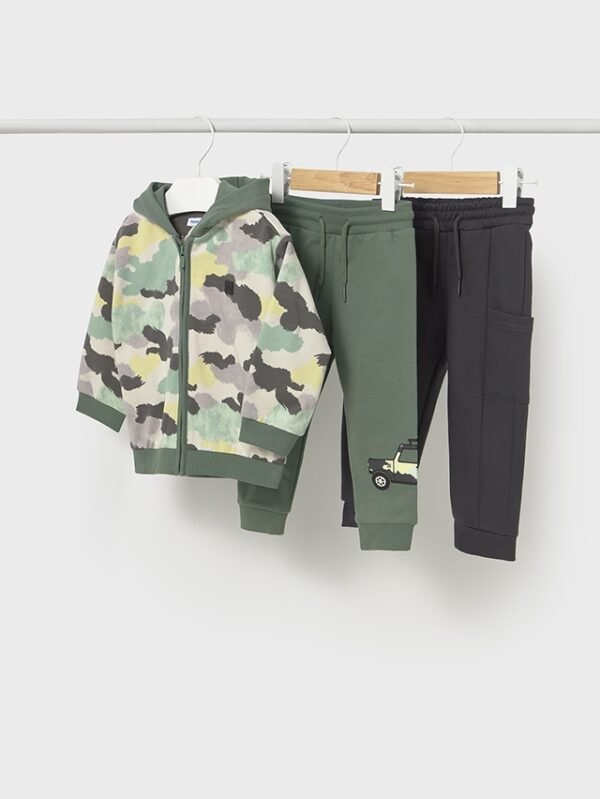 Felpa manica lunga per neonato. Colletto con cappuccio. Chiusura centrale con cerniera. Polsini e orlo elasticizzati per una migliore vestibilità. Stampa camouflage. Pantalone per neonato della linea sporty, molto comodo. Elastico in vita. Vita elasticizzata con cordoncino regolabile. Orlo elasticizzato per una migliore vestibilità. Tasche laterali. Pantalone per neonato della linea sporty, molto comodo. Elastico in vita. Vita elasticizzata con cordoncino regolabile. Orlo elasticizzato per una migliore vestibilità. Elementi decorativi: Serigrafia (print).Tuta 2 pantaloni stampati neonato