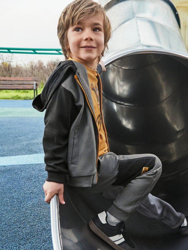 Felpa manica lunga per bambino. Colletto con cappuccio. Chiusura centrale con cerniera. Modello con varie tasche. Pantalone per bambino. Vita elasticizzata con cordoncino regolabile. Ginocchiere rinforzate nella parte interna pensate per donare maggiore resistenza nella zona più esposta ad usura. tasca laterale. Pantalone per bambino. Vita elasticizzata con cordoncino regolabile. Ginocchiere rinforzate nella parte interna pensate per donare maggiore resistenza nella zona più esposta ad usura. Tasca funzionale posteriore.Tuta 2 pantaloni stampati neonato