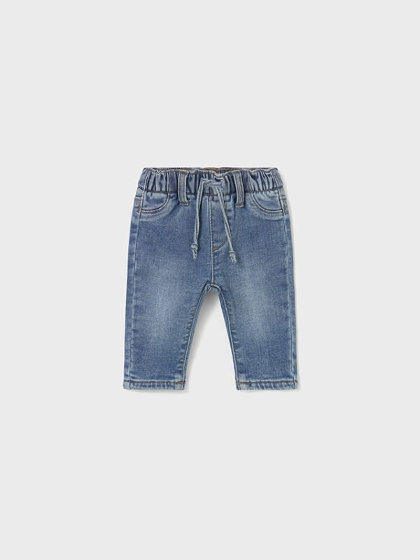 Pantalone per neonato modello jogger ampio nella parte superiore e più stretto nella caviglia. Ideale per un look sportivo e che riflette la tendenza di strada. Finta patta. Vita elasticizzata con cordoncino regolabile. Comodo e morbido denim di cotone elasticizzato. Modello con finte tasche nella parte anteriore e tasche funzionali nella parte posteriore. Effetto degradè ottenuto mediante processo Ecowash di minore impatto ambientale. Modello appartenente alla nostra collezione Mayoral Basic, un articolo essenziale nel suo armadio utile a completare qualsiasi look.