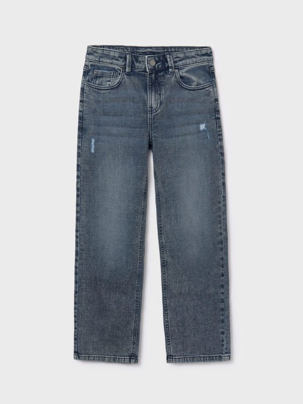 Pantalone per bambino con taglio gamba ampio e retto, vita e fianchi aderenti. Vita alta. Chiusura con cerniera e bottone. Elastico regolabile in vita che garantisce un migliore vestibilità. Tessuto in jeans comodo e abbinabile per look di tutti i giorni. Modello con varie tasche. Per motivi di sicurezza, nelle taglie piccole (2-5 anni) la cerniera è sostituita da una finta patta.
