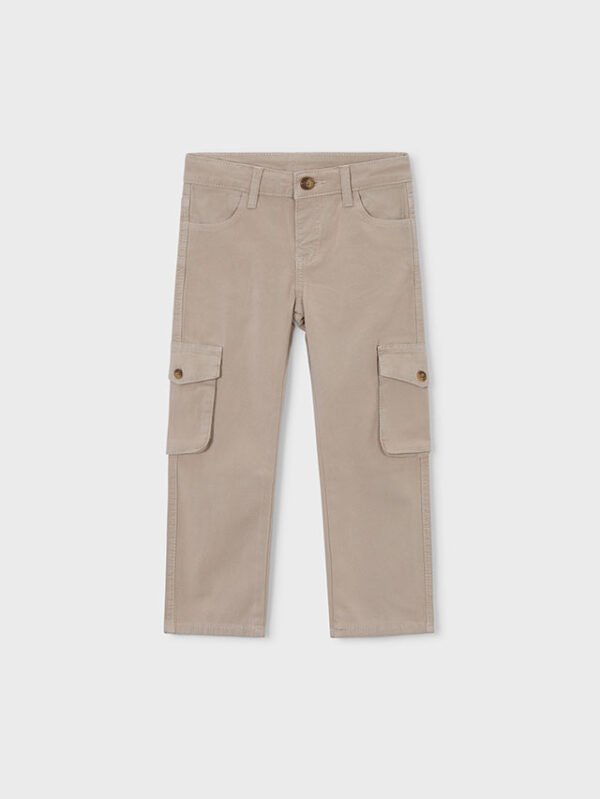 Pantalone per bambino stile cargo: ampio nella parte superiore, con cavallo basso e vestibilità normale sulla gamba. Chiusura con un unico bottone. Elastico regolabile in vita che garantisce un migliore vestibilità. Orlo elasticizzato per una migliore vestibilità. Modello con varie tasche. Per motivi di sicurezza, nelle taglie piccole (2-5 anni) la cerniera è sostituita da una finta patta.