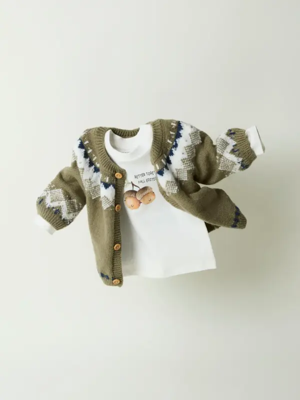 Maglionino bambino verde oliva con disegni grafici bianchi e blu e bottoncini effetto legno