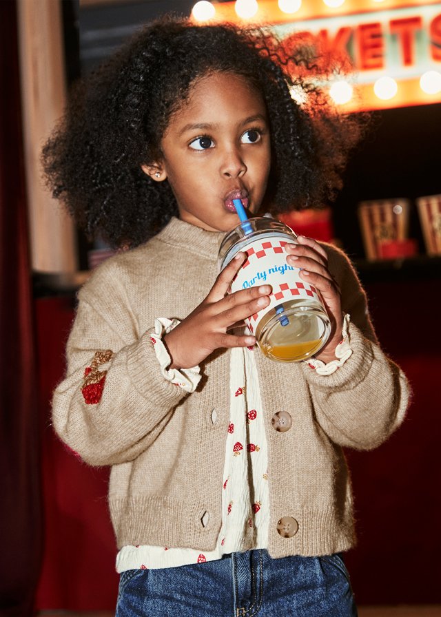 Contiene poliestere riciclato. Cardigan manica lunga per bambina. Girocollo. Chiusura con bottoni nella parte anteriore. Comodo tessuto di punto. Tessuto in tricot morbido al tatto.