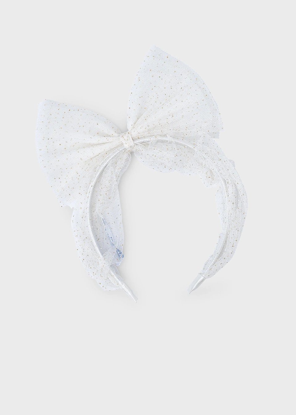 Originale cerchietto per bambina perfetto per rifinire il suo look. Confezione in tulle leggero e vaporoso. Elementi decorativi: fiocco.