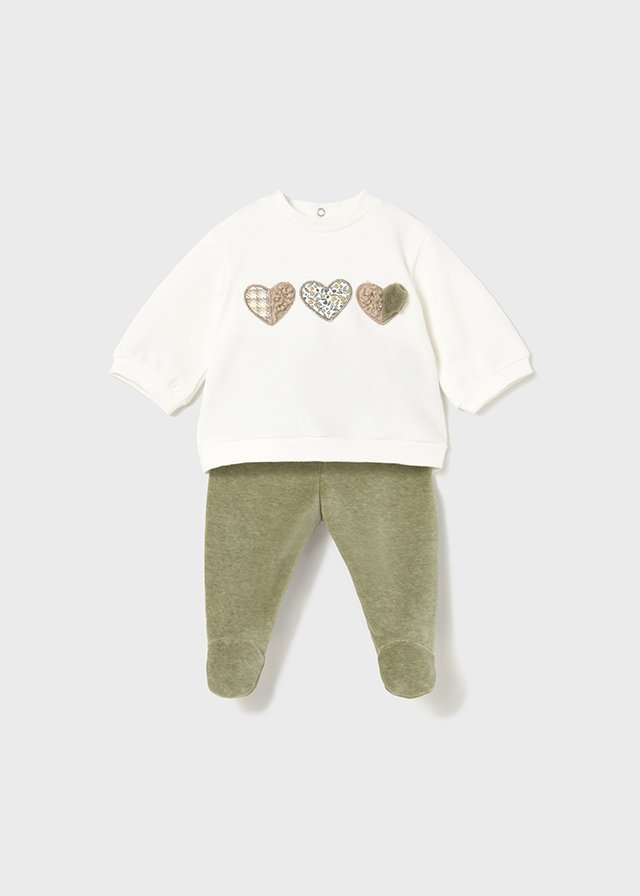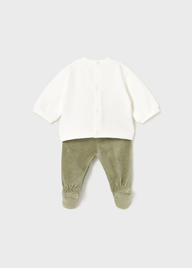 Questo completo in tricot di due pezzi per neonato è costituito da maglioncino e ghettina abbinata.
