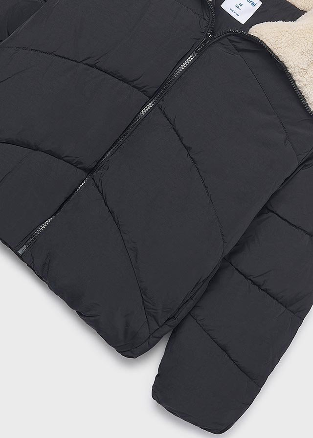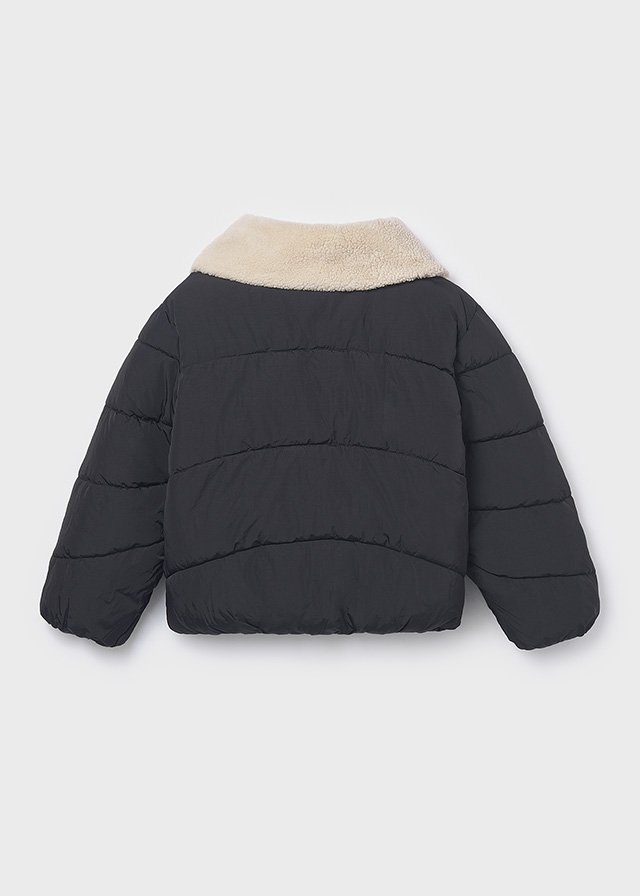 Contiene poliammide riciclato. Giaccone manica lunga per ragazza. Colletto con pellicciotto. Chiusura centrale con cerniera. Esterno in tessuto con effetto imbottito. Morbida fodera interna in poliestere. Colore nero
