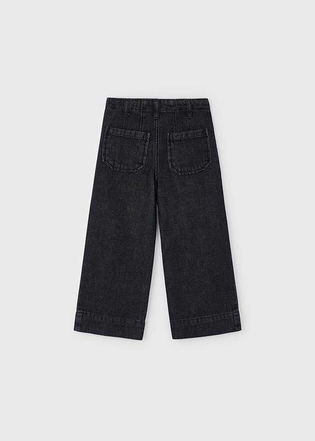 Pantalone bambina svasato, ampio sulla parte inferiore. Elastico regolabile in vita che garantisce un migliore vestibilità. Tessuto in jeans comodo e abbinabile per look di tutti i giorni. Modello con pinces. Tasche funzionali nella parte anteriore