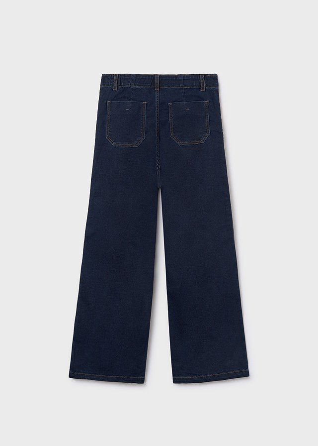 Pantalone ragazza svasato, ampio sulla parte inferiore. Elastico regolabile in vita che garantisce un migliore vestibilità. Tessuto in jeans comodo e abbinabile per look di tutti i giorni. Tasche funzionali nella parte anteriore. Tasche funzionali posteriori.