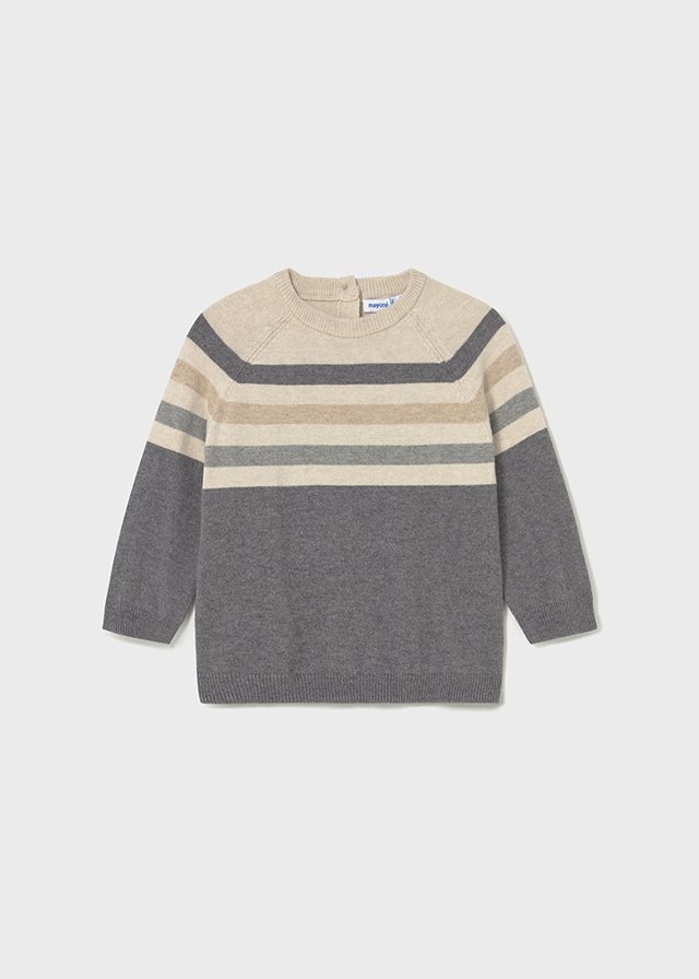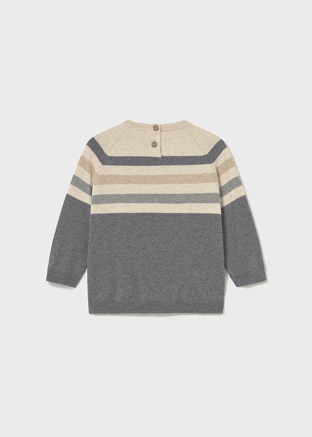 Contiene poliammide riciclato. Maglione manica lunga per neonato. Girocollo. Chiusura con bottoni nel colletto che facilita la vestibilità del capo. Trama a righe.