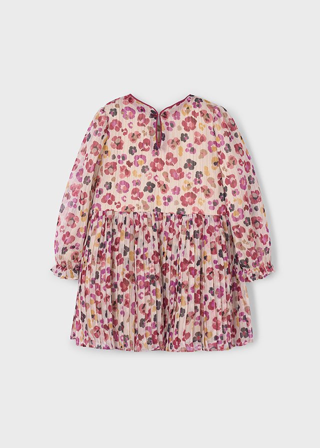 Vestito manica lunga per bambina con volant sul bordo della manica. Girocollo. Piccola apertura sulla schiena con chiusura con bottone per facilitare la vestibilità del capo. Morbida fodera interna in poliestere. Modello con riccio e volant. Elementi decorativi: fiocco. Design stampato.