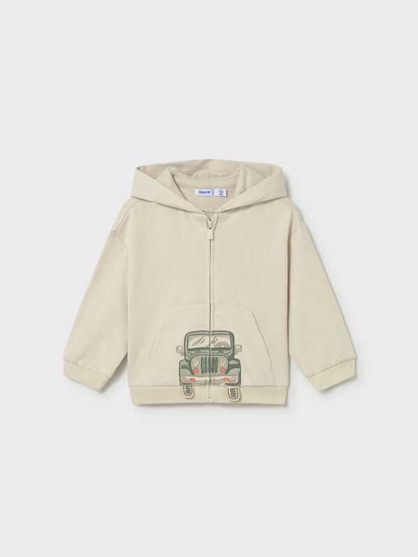 Felpa manica lunga per neonato. Colletto con cappuccio. Chiusura anteriore con cerniera nascosta. Elementi decorativi: applicazione decorativa, Serigrafia (print).